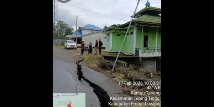 Hujan deras dan angin kencang membuat jalan provinsi di Empat Lawang ambles, mengancam akses warga dan fasilitas ibadah.