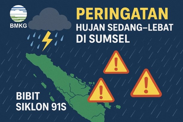 BMKG mengeluarkan peringatan hujan sedang–lebat di Sumsel akibat bibit siklon 91S. Warga diminta waspada potensi banjir, angin kencang, dan longsor. (*/ILS)