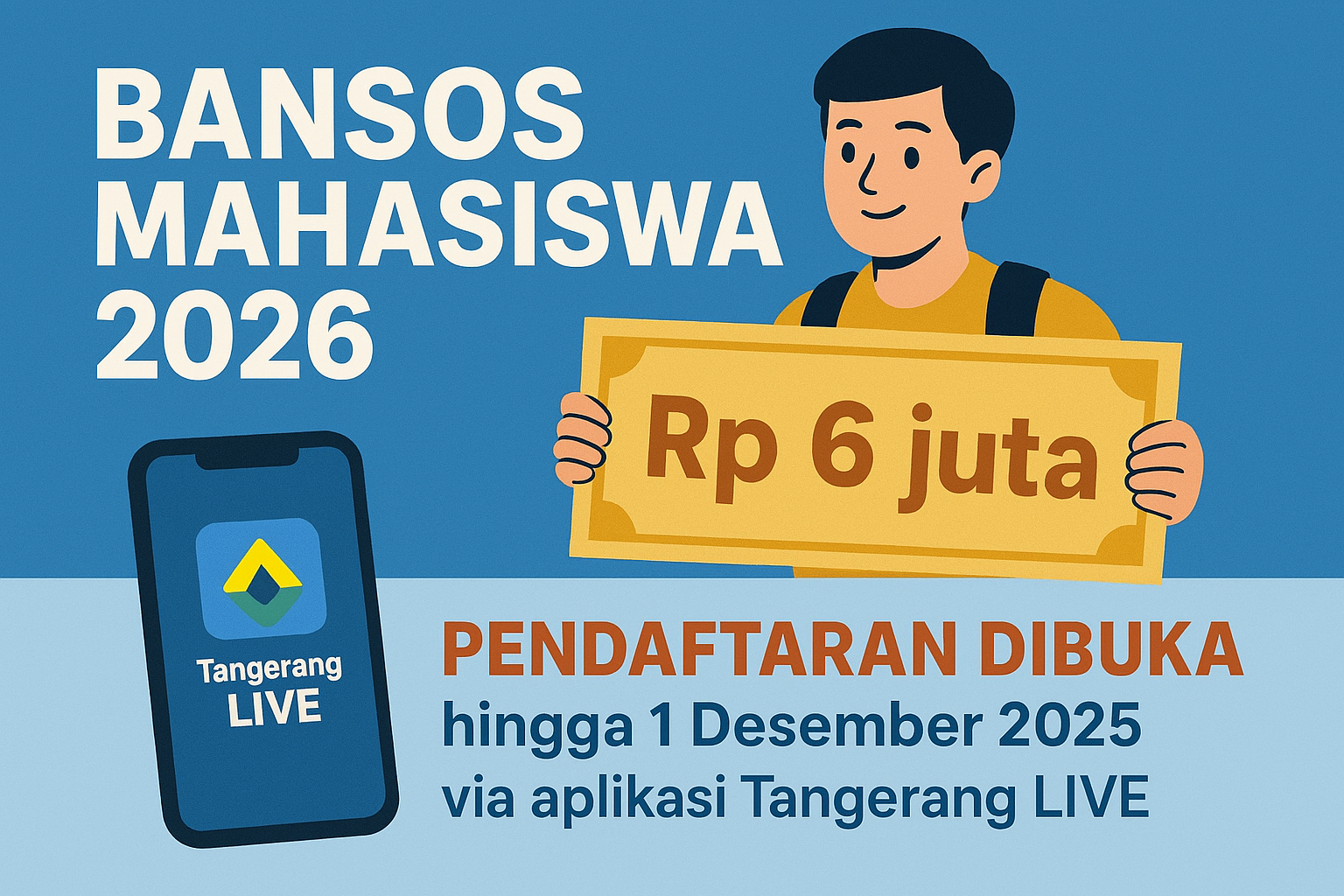 ° Pendaftaran Bansos Mahasiswa Pemkot Tangerang TA 2026 sebesar Rp 6 juta resmi dibuka (17/11/2025) hingga 1 Desember 2025 via aplikasi Tangerang LIVE.