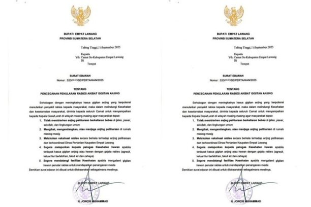 Bupati Empat Lawang, Dr H. Joncik Muhammad, resmi mengeluarkan Surat Edaran Nomor 520/12/1/SE/PERTANIAN/2025 tentang Pencegahan Penularan Rabies Akibat Gigitan Anjing.