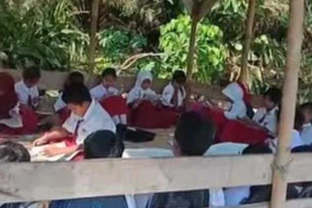 Dalam video itu, terlihat para pelajar duduk di bangku sederhana di dalam sebuah pondok beratap seng.
