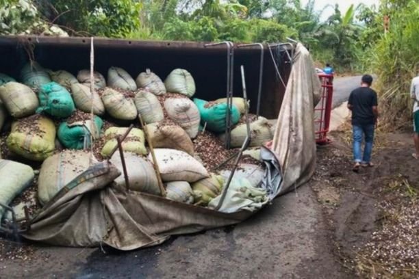Truk Bermuatan 10 Ton Kulit Kemiri Terguling di Empat Lawang